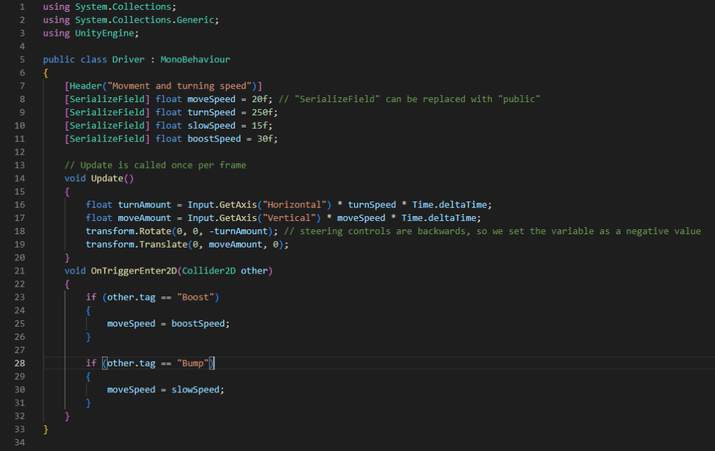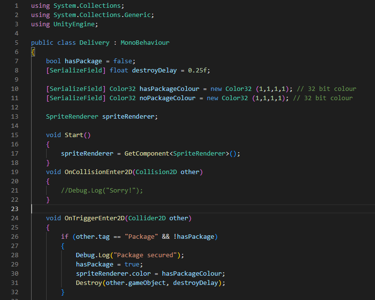 Delivery Driver Deliver packages around the neighbourhood! Features to add: UI Timer & Scoring Sound effects More levels Partial code screenshots: